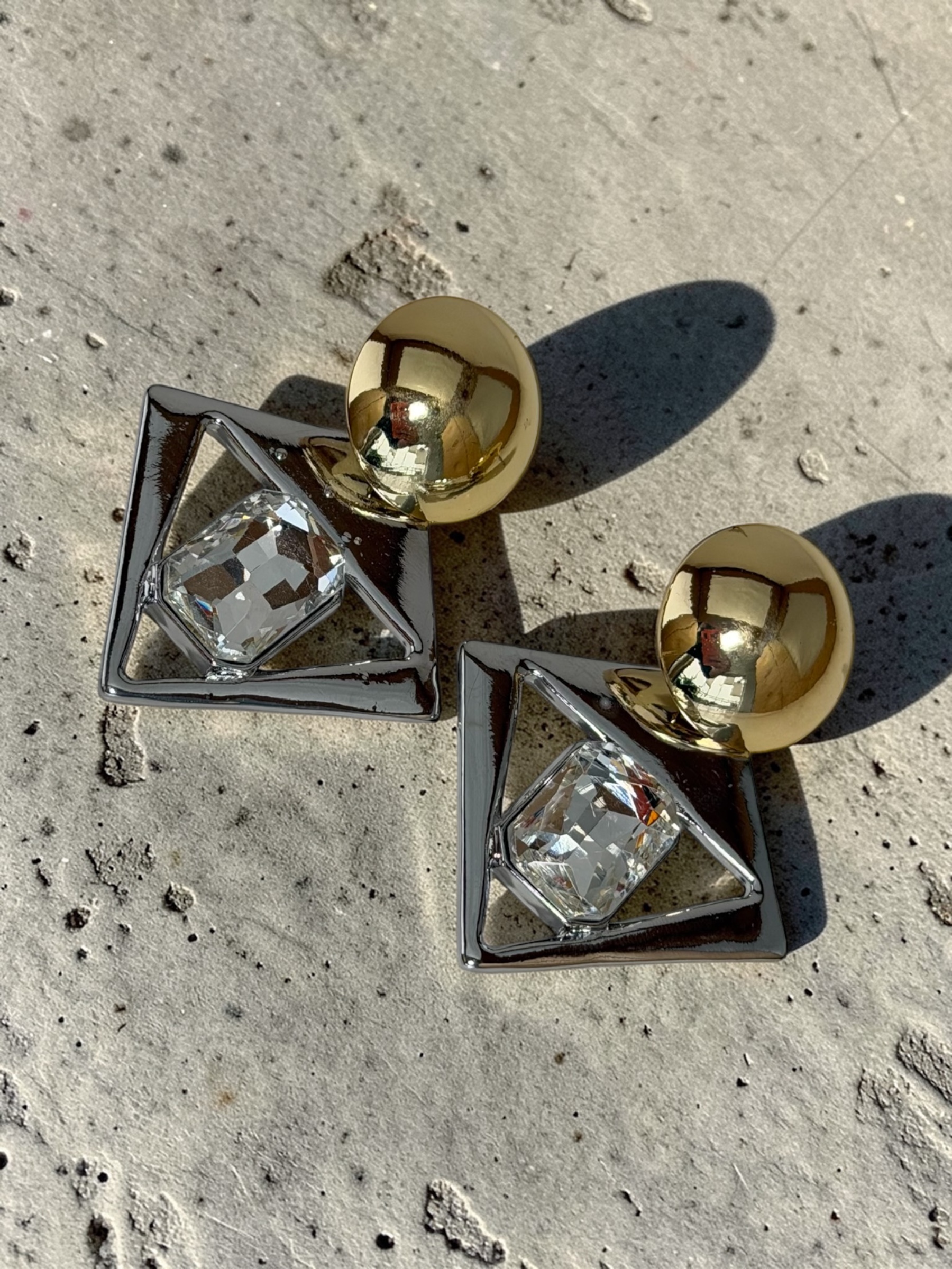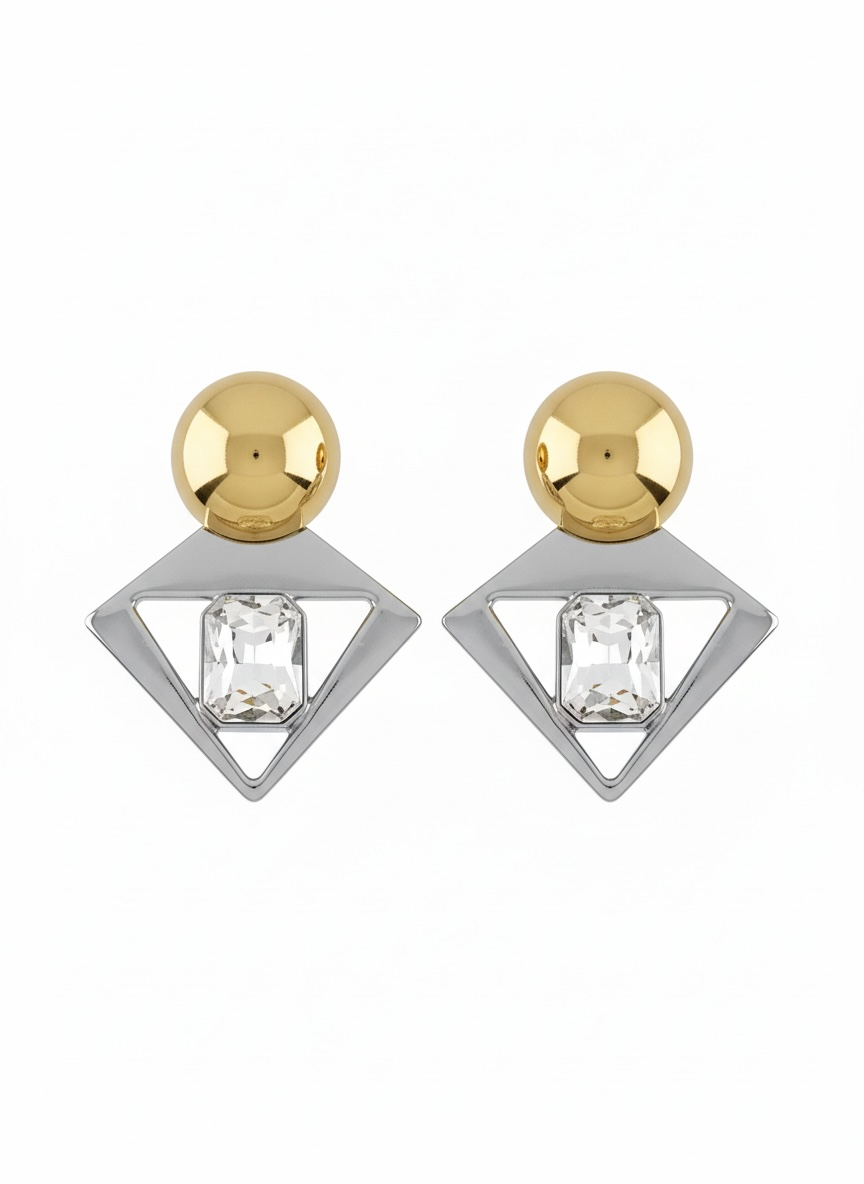 Tasarım: Üstte altın rengi küre, altta gümüş rengi üçgen ve baget kristal taş kombinasyonu.