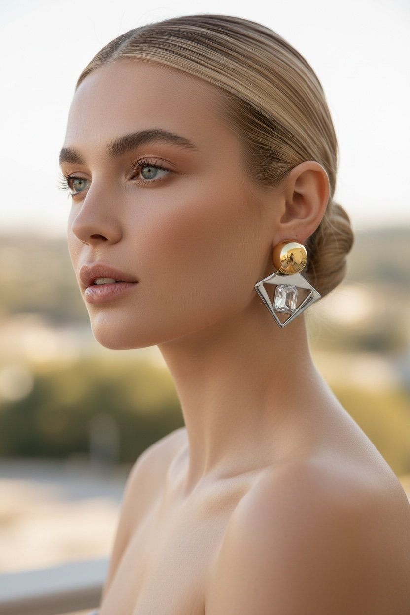 Sıradanlıktan uzak, mimari bir estetikle tasarlanan bu küpe, farklı formların ve metal renklerinin birlikteliğini kutluyor. Ortasındaki baget kesim taşın sunduğu kristal berraklığı, yüzünüze aydınlık bir ifade katar.