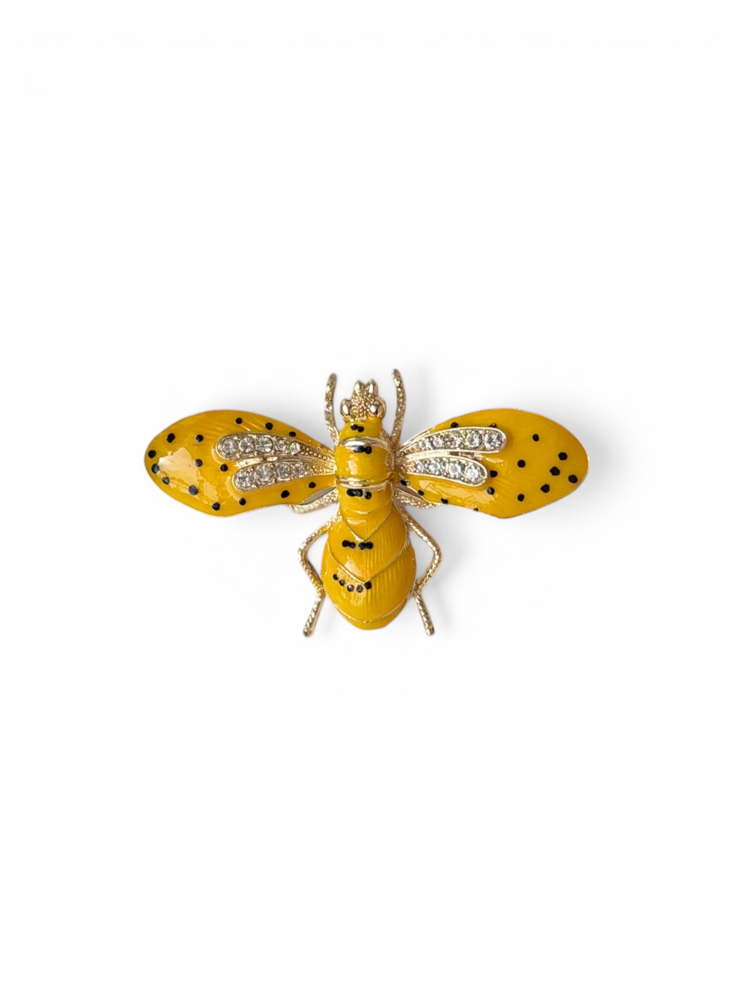 Tasarım: Stilize arı formu, canlı sarı mine üzerine siyah puantiye desenleri.