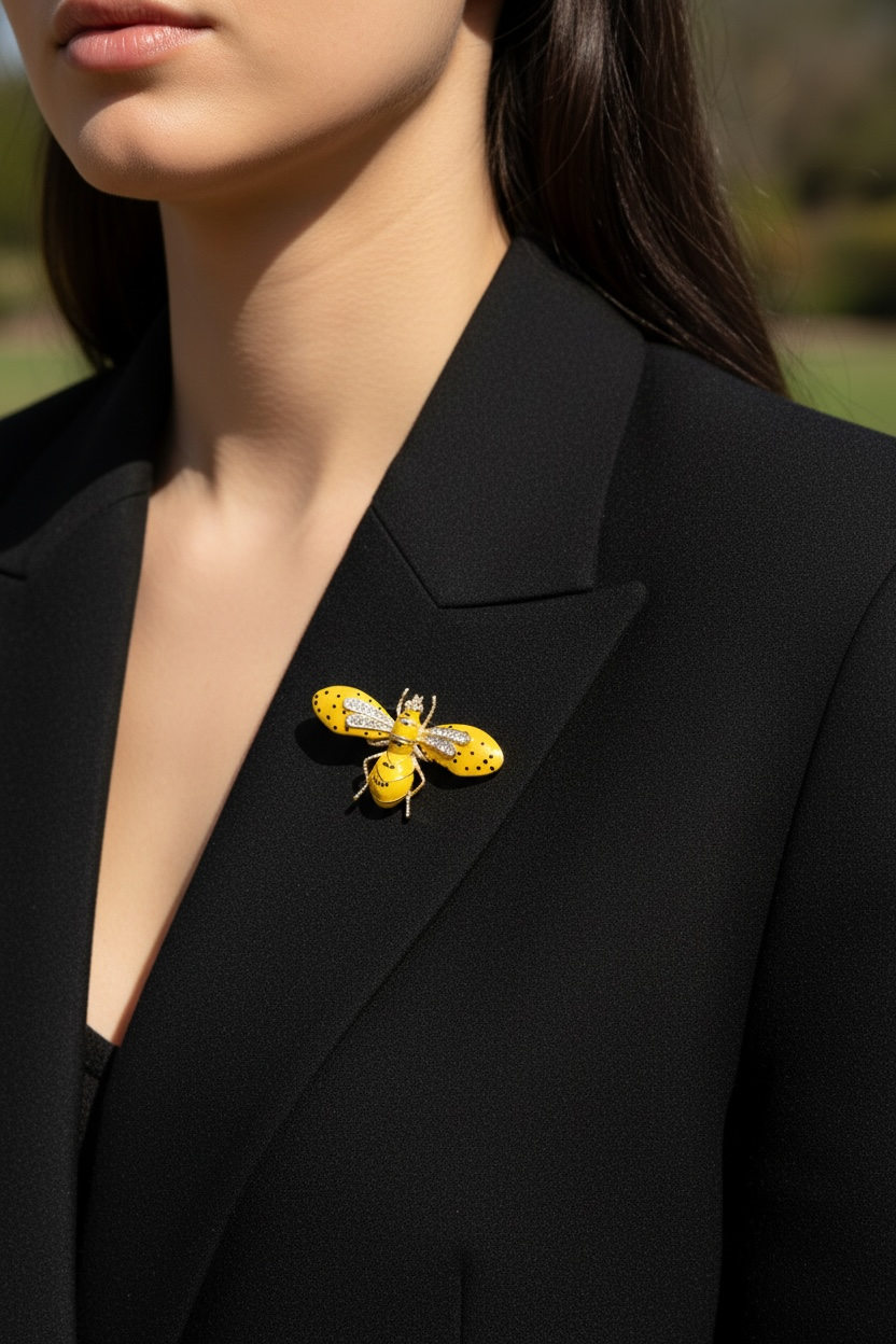 Doğanın en ikonik sembollerinden biri olan arı figürü, 888 Balance’ın yaratıcı tasarım anlayışıyla sanatsal bir aksesuara dönüşüyor. Bu özel tasarım broş, canlı sarı mine kaplaması üzerine işlenen siyah puantiye detayları ve kanat kısımlarında yer alan kristal taş işlemeleriyle dikkat çekiyor. Altın kaplama detaylarla zenginleştirilen bu parça, hem retro bir dokunuş hem de modern bir şıklık sunuyor. Stilinde fark yaratmak isteyenler için ceketlerden fularlara kadar her alanda kullanılmak üzere özenle tasarlandı.