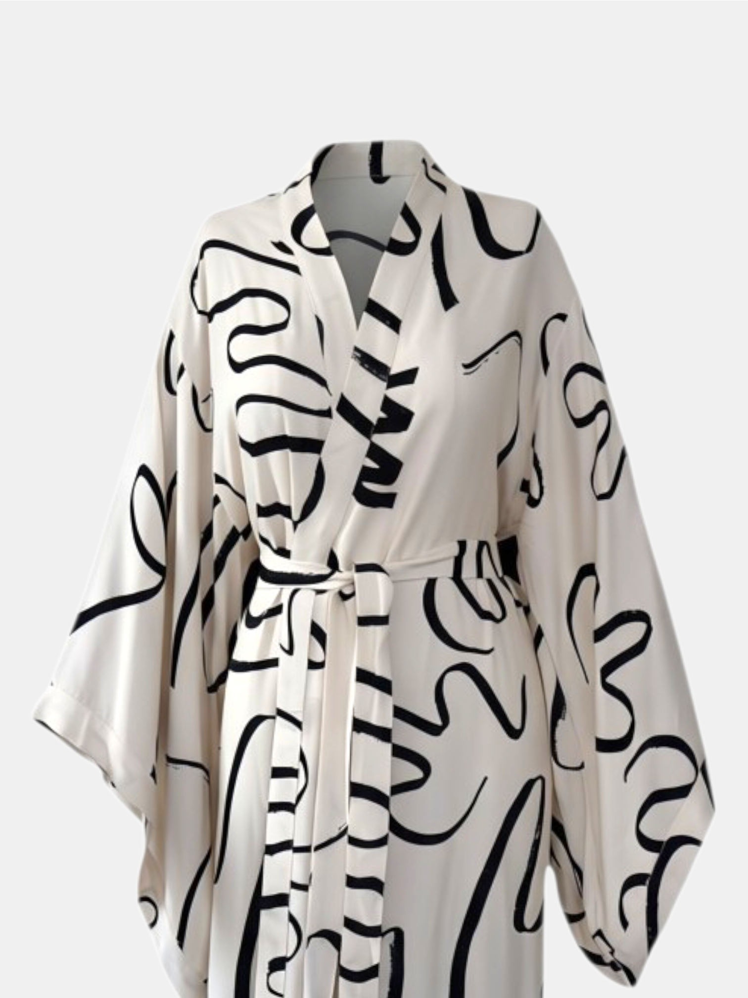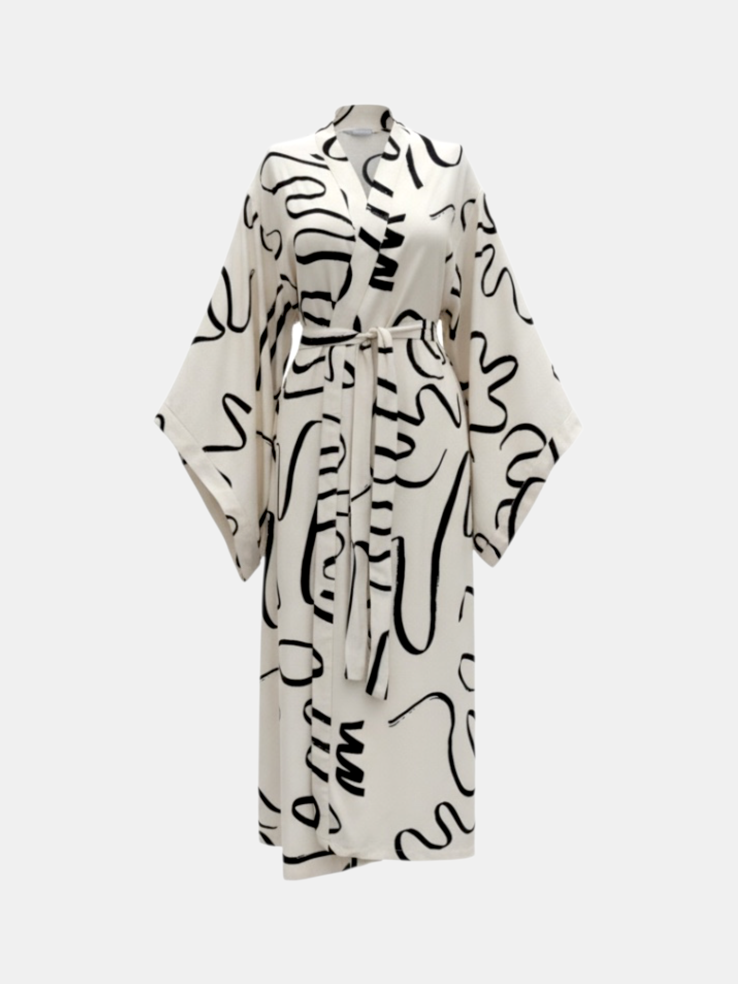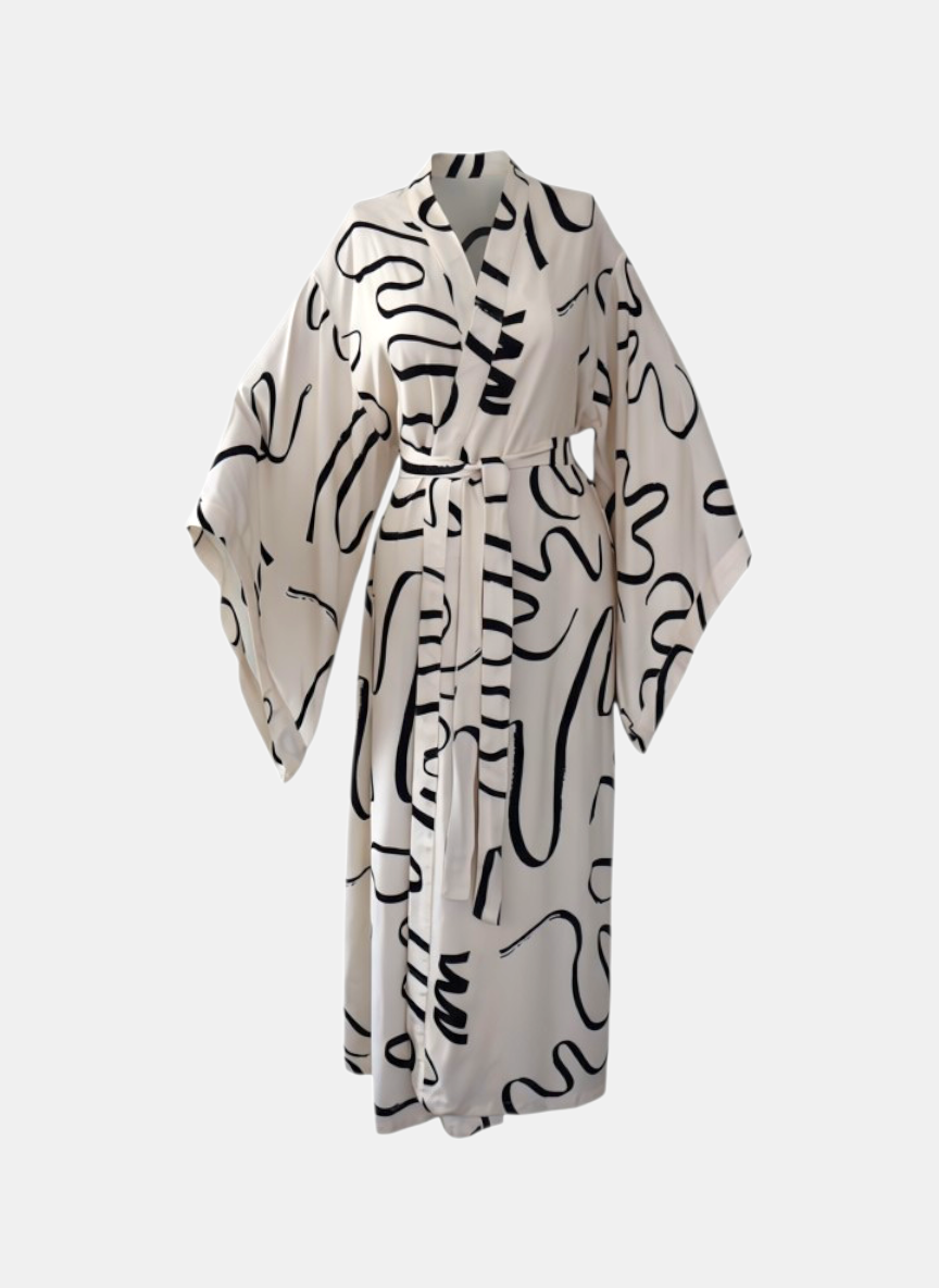 Stilinize sanatsal bir dokunuş katın. 888 Balance koleksiyonunun öne çıkan parçalarından biri olan bu uzun kimono, viskon kumaşın sunduğu hafiflik ve yumuşaklık ile gün boyu konfor sağlar. Siyah soyut desenlerin ekru zemin üzerindeki dinamik uyumu, zamansız bir şıklık yaratır.