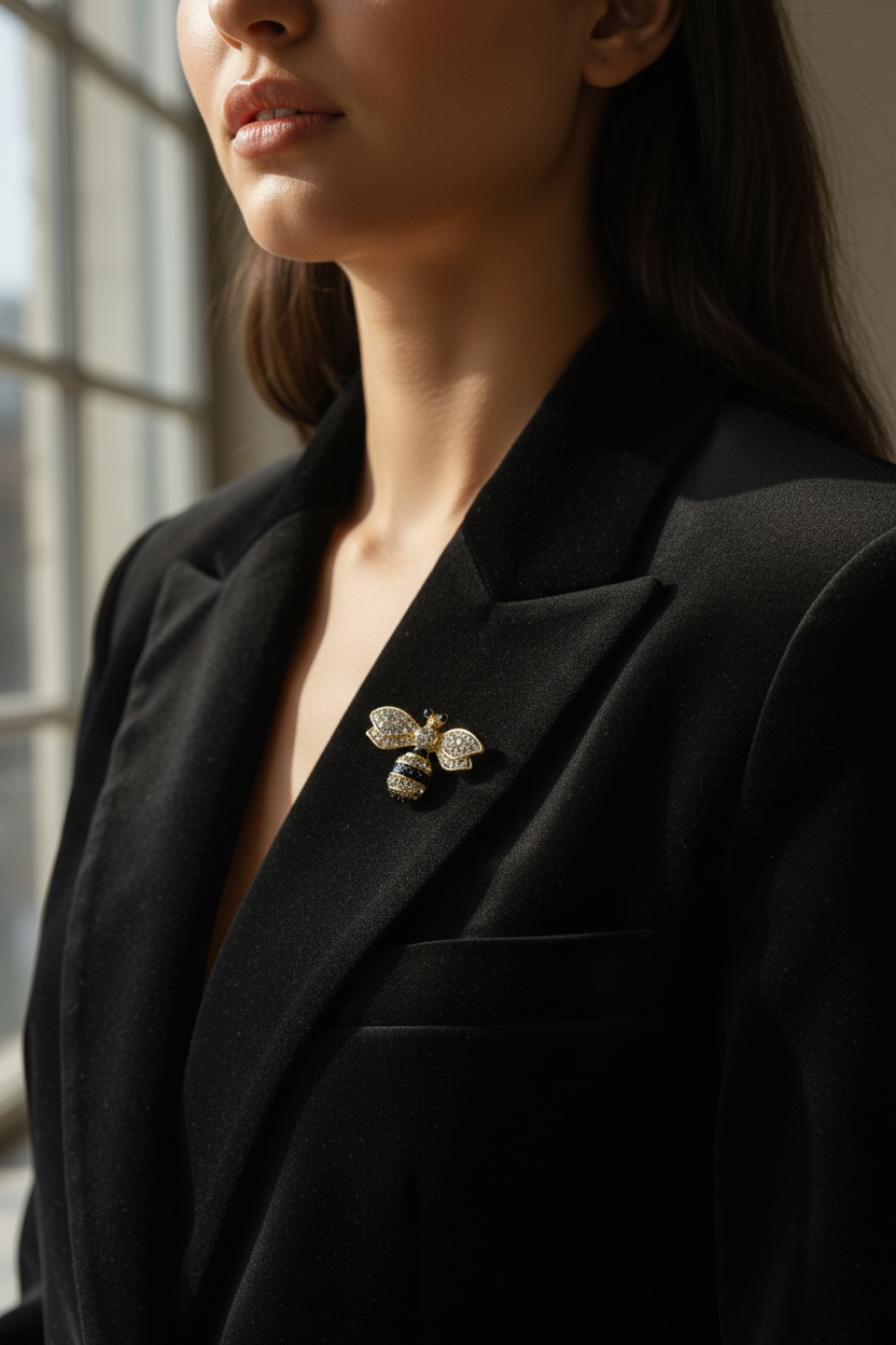 Tasarım: Detaylı arı formu, tamamı kristal taş işçiliği ve siyah mine detayları.